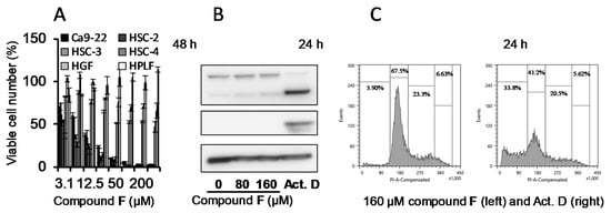 7-Methoxy-2-(4-morpholinyl)-4H-1-benzopyran-4-one (Compound F, Figure 4F) showed higher cytotoxicity against human OSCC cell lines as compared with normal oral mesenchymal cells (A), without induction of caspase-3 activation (B) nor producing subG1 cell population (C). Actinomycin (Act. D) (1 μM) was used as positive control. Cited from Reference [35] with permission.
