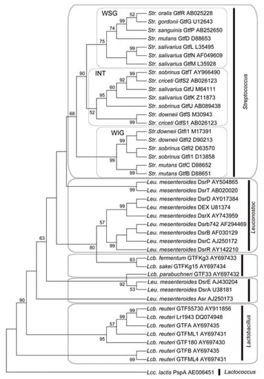 The accession numbers in NCBI of these glycosyl hydrolases are provided after species and enzyme name in Figure 6. Here, we have shown that enzymes in the lower part of the phylogenetic tree synthesize glucans with various linkage types such as α-1,3; α-1,6; α-1,2; and α-1,4, while those in the upper part of the tree synthesize only water-soluble α-1,6-linked glucans. The phylogenetic tree would suggest that the streptococcal GTFs were derived from other lactic acid bacteria following their spread through the genera in the order of Lactococcus, Lactobacillus, Leuconostoc and Streptococcus and that the streptococcal GTF family can be phylogenetically classified into 3 clusters: the water-soluble glucan-synthesizing group (WSG), the water-insoluble glucan synthesizing group (WIG) and the intermediate group (INT).