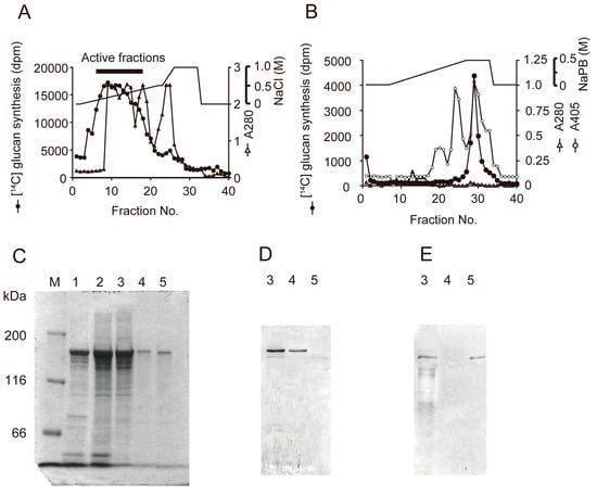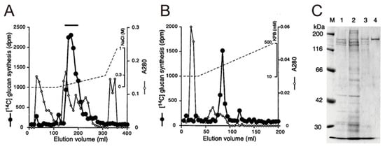 Native WSG-synthesizing GTF, for example, GTFR was purified from Streptococcus oralis (S. oralis) ATCC 10557 [53], cultured in dialyzed TTY medium [50]. The culture supernatant was precipitated by 60% saturated ammonium sulfate and then applied to a Q Sepharose FF column and eluted with a linear gradient of 0 to 1.0 M NaCl [51]. Active fractions (indicated by bars) were pooled, applied to a Bio-Scale CHT10-I column and then eluted with a 10 to 500 mM KPB linear gradient [51]. To select the GTFR, the glucan synthesis assay and SDS-PAGE were carried out (Figure 8) [53].