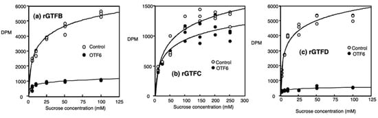 Changes in the quantity of glucan produced by recombinant GTFs. GTF activity was measured with [14C-glucose] sucrose. The OTF6 concentration in all displayed data was 1.0 mg/mL. Data are given in counts per minute. GTFs and sucrose were reacted without (○) and with (●) OTF6. Cited from Reference [72] with permission.