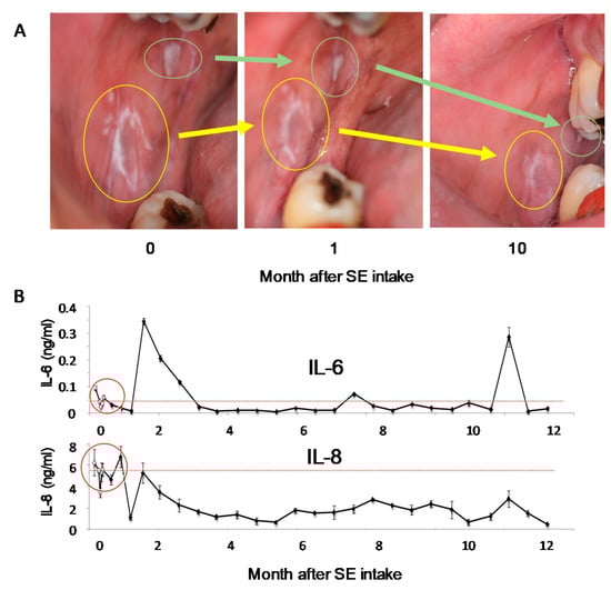 Effect of SE treatment on the oral lichenoid dysplasia. (A) Oral inspection with a digital camera, (B) salivary IL-6 and IL-8 concentrations. Cited from Reference [107] with permission.