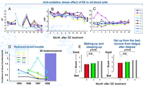 Anti-oxidative stress effects on chronic dialysis patients. (A) Superoxide (O2-) (measured by luciferin chemiluminescence method), (B) LPO (measured by HPLC), (C) SOD activity (xanthine ·xanthine oxidase reaction) of red blood cells. (D) Incidence of shunt problem from 1996–1998. Patients were treated with SE after 1 November 1997. (E) Questionnaire about the clinical effect of SE. Cited from Reference [108] with permission.