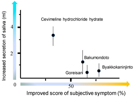 Xerostomia is a disease in which a reduction in salivary secretion causes oral dryness and it may also be further complicated with odontonecrosis, periodontal disease, candidiasis, and taste disorders. The exacerbation of these diseases has a substantial effect on the QOL, so it is necessary in such cases to clarify the causes and select the most appropriate treatment. Herbal treatment alleviated thirst and oral dryness in most cases but many cases showed a slower increase in salivary production than the cases administered cevimeline hydrochloride [111] (Figure 13).