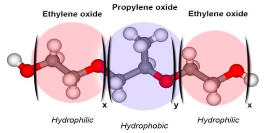 Poloxamer derivatives are a family of copolymers, characterized by different molecular weights of building blocks and the ratio between PPO and PEO units (Figure 1) [20]. Poloxamers are GRAS (generally recognized as safe) excipients widely used in the pharmaceutical industry [16,21,22].