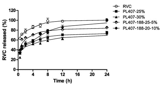 Akkari and coworkers used ropivacaine (RVC) as a model drug in order to evaluate the influence of its encapsulation within P407/poloxamer 188 (P188)-thermo-sensitive hydrogels for the treatment of post-operative pain following local administration [42]. In fact, P407 is often used in association with other poloxamers, especially with P188, in order to modulate the sol–gel transition temperature (Tsol–gel) [16]. RVC is a long-acting local anesthetic widely used in surgical procedures and has turned out to be an interesting alternative to epidural administration, and used as an infiltrative anesthesia and as a means of post-operative pain relief [43]. Observation during in vitro release experiments revealed a slower RVC leakage from the hydrogel made up of the two copolymers with respect to the formulation prepared using P407 as a single agent or a solution of the drug (Figure 2).