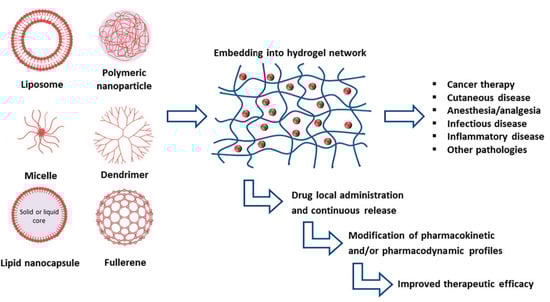 Despite their multiple benefits, P407-based hydrogels are characterized by a short residence time, due to their rapid dissolution in aqueous media and biological fluids [24]. Various approaches have been explored to overcome these limitations by adding bioadhesive polymers such as carbopol, sodium alginate, polycarbophil, hyaluronic acid, and chitosan to the structure with the aim of improving the strength, bioadhesiveness, and the residence time of the gel [45,46,47,48]. In addition, it has proved difficult to effectively encapsulate poorly water-soluble drugs in P407 hydrogels [49,50]. The inclusion of advanced drug delivery systems such as liposomes or polymeric nanoparticles in the hydrogel structure has offered interesting perspectives [18]. In recent years, the association of different pharmaceutical technologies has favored the development of innovative formulations able to improve the therapeutic efficacy of various drugs. In particular, nanocarrier-loaded gels have shown promising preclinical results for medical applications and for the treatment of a large number of diseases (Figure 3) [4].