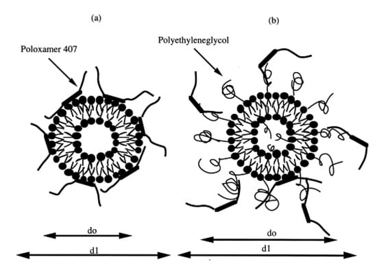 Mechanism of interaction between P407 and conventional (a) or sterically stabilized (b) liposomes. (d0 = diameter of liposomes); (d1 = diameter of liposomes embedded in P407) [92].