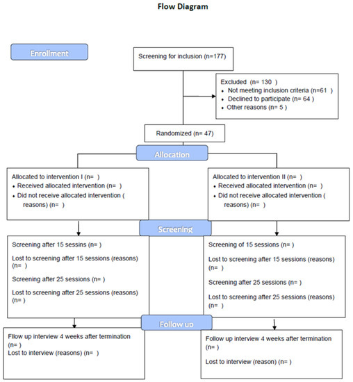 The trial status is currently ongoing. Recruitment started in March 2016 and will continue until the end of May 2019, with the expected last participant visit in December 2019. Due to low rates of recruitment, a total of 47 participants have been included by November 2018, from the 177 referred to the study (see Figure 1). We currently aim to include a total of 60 participants. Concerning blinding, we have currently been informed that three participants receiving intervention II have expressed that they know they are not receiving music therapy due to previous experiences with music therapy. So they are not blinded. This will be transparent in the analysis of the data. In spite of challenges concerning motivation and attendance, many participants have so far been able to attend all sessions offered. The results of the current trial will be widely disseminated at national and international scientific conferences and in further scientific articles.