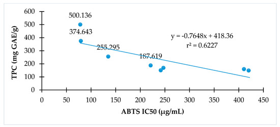 The relationship between antioxidant activities and total phenolic of C. hindsii by ABTS radical scavenging activity method.