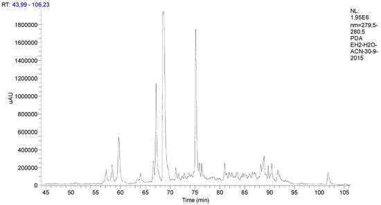 The phenolic components of the aqueous extract were purified by adsorption to solid phase extraction C18 columns (500 mg/3 mL, Ref. 7020-03, J.T. Baker, Porto Salvo, Lisboa, Portugal) and the mobile phase used was acetonitrile and formic acid in water (0.1% v/v). The eluted extracts were combined and concentrated to their initial volume and clarified through a 0.22 µm filter previously examined. The chromatographic examination was performed in an HPLC system (SpectraSystem, Thermo, Darmstadt, Germany), furnished with a Thermo C-18 column, and a diode array detector (DAD). Elution was performed with 0.1% formic acid (solvent A) and a mixture of 90% acetonitrile + 9.9% water + 0.1% formic acid (solvent B), at a stream speed of 0.8 mL/min. The pump was programmed with 2% solvent B during 10 min, increasing to 20% at 60 min and to 98% at 140 min, followed by a re-equilibration step of 10 min to reach the initial condition of 2% B. Spectra acquisition was made in the range of 190 nm to 700 nm with selective detection at 280 nm (phenolics in general, hydroxybenzoic acids, procyanidins or catechins), 320 nm (hydroxycinnamic acids, flavones) and 360 nm (flavonols). Identification of the main functional groups present in the extract was performed by a comparison of their UV spectra with those of representative standards analysed under the same conditions and from literature data. The determination of Total phenolic compounds (PCs) concentration present in the spearmint was assessed by the Folin–Ciocalteu method [23]. Gallic acid was applied as standard, and the assay results were expressed as means of at least three replicates (mg gallic acid equivalents (GAE)/L and mg GAE/g of spearmint). RA quantification was performed by response factor calculations using the chromatographic area of a 1 g/L standard co-injected in the same analytical conditions.