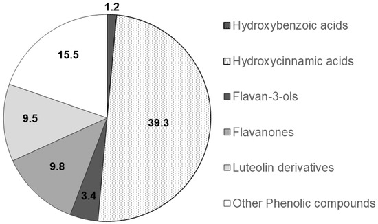 Relative chromatographic area distribution of the main phenolic functional groups detected in the Mentha spicata aqueous extract.
