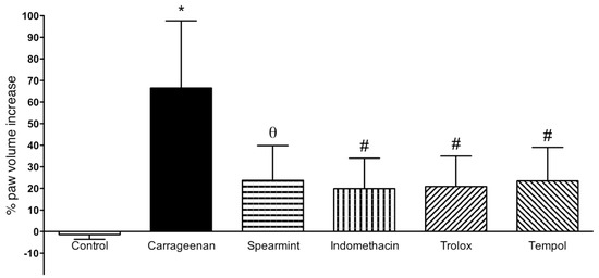 Effect of Spearmint extract administration on the paw oedema volume induced by carrageenan. * p < 0.001 vs. Control; θ p < 0.01 vs. Carrageenan; # p < 0.001 vs. Carrageenan.