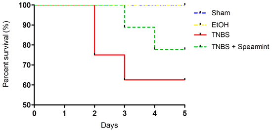 - TNBS + Spearmint group (n = 9): The colitis induction protocol was followed as described in the previous experimental group. Spearmint extract (15 mg/kg of phenolic acids by oral gavage) was administered to animals throughout the four days of the experiment.