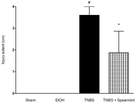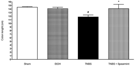Effect of spearmint extract administration on colon length (cm). # p < 0.001 vs. Sham; * p < 0.001 vs. TNBS.