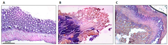 Effect of the spearmint extract administration on the histological features of colon inflammation. (A) Sham group, (B) TNBS group, (C) TNBS + spearmint group. Original magnification × 100. Scale bar equals 200 µm.