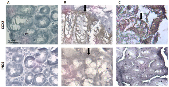 Regarding COX-2 and iNOS expression, they are identified by a ‘brownish’ coloration (Figure 9). The sham group did not present any brown coloration, which indicates that the expression of COX-2 and iNOS, if any, appears to be insignificant, and this is consistent with the absence of an inflammatory stimulus. The TNBS group showed an increased expression of COX-2 and iNOS, which is in accordance with the previous studies, given the inflammation associated to colitis in these animals [28]. The spearmint group presented a reduced expression of iNOS although the COX-2 expression was not significantly inhibited (Figure 9C).