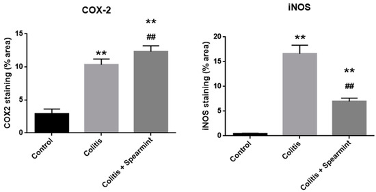 Effect of spearmint phenolic extract administration on the colon tissue expression of COX-2 and iNOS. The production of COX-2 and iNOS staining were quantified. ** p < 0.01 vs. Control; ## p < 0.01 vs. Colitis.