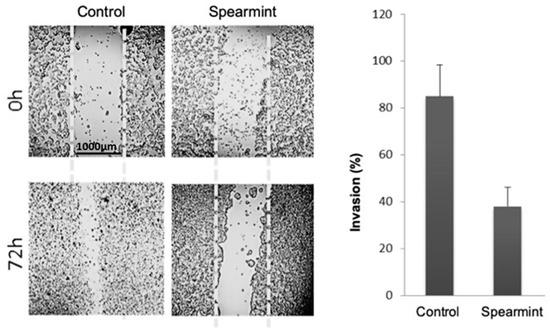 - Wound healing assay: The spearmint concentration of 500 µg phenolics/mL was further evaluated for its inhibitory activity on HT-29 colon cancer cells. For cell migration study, the wound healing assay was achieved as previously reported [30]. The counting of migrating cells into the wound gap, in three random fields, from each triplicate treatment was performed, and data are expressed as the mean ±S.D.