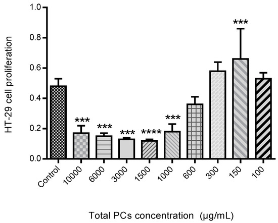 In the in vitro assay with HT-29 cells and gelatinolytic activities, all tests were performed in triplicate, at least three different times, with the results being communicated as the mean ± S.D. SigmaPlot software (version 12.5, Systat Software Inc. (SSI), San Jose, CA, USA) was applied so as to match different handlings, using one-way or two-way ANOVA. To compare differences between groups Tukey’s test was used, as well as Dunnett’s test. p-values lower than 0.05 were considered to be of statistical significance.