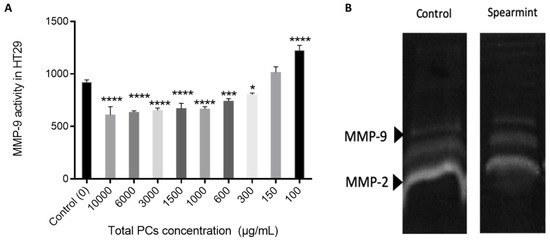 Although it appears that inhibition of MMPs would be beneficial to improve signs and symptoms of IBD and to prevent the development of CRC [82], previous studies from this team’s work have already shown that phenolic extracts might reduce inflammation in experimental colitis and reduce migration/invasion and proliferation capacities of HT-29 cells without acting through the reduction of MMPs activities [28], also suggesting that these spearmint extract effects are not related with MMP’s inhibition but with other mechanisms. In fact, nitric oxide production and iNOS expression have been identified as having pivotal roles in the proliferation and metastasis of several cancer types [83,84], including CRC [85], which might be a potential target explaining the beneficial effects of this spearmint extract.