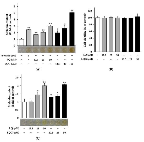 First, we examined the effects of LQ and LQG on melanin synthesis in murine melanoma B16-F1 cells. The cells were treated with LQ or LQG at several doses (12.5, 25, or 50 μM) for 72 h, then the melanin content was determined using a melanin-content assay. The α-MSH was used as a positive control [47,48]. LQ and LQG significantly increased melanin content in a dose-dependent manner, as shown in Figure 2A. The color of cell pellets lysed with 1 M NaOH was darker after treatment with LQ and LQG. In addition, we measured the cytotoxicity of LQ and LQG in B16-F1 cells using the MTT assay. As shown in Figure 2B, LQ and LQG did not affect cell viability at concentrations that increased melanin content, clearly indicating that their effects were not attributable to cell proliferative activities. Furthermore, we observed the effects of LQ and LQG on melanin synthesis in human melanoma HMVII cells (Figure 2C). LQ and LQG increased melanin production and darkened the cell pellets in a similar manner as in the B16-F1 cells. Melanin synthesis by LQG was higher than that by LQ in both cell lines.