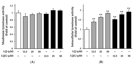 Effects of LQ and LQG on tyrosinase activity. (A) The effects of LQ and LQG on mushroom tyrosinase activity were determined as described in Materials and Methods. There were no significant differences between the control and experimental groups (p > 0.05). (B) B16-F1 cells were treated with LQ or LQG at the indicated concentrations for 72 h, and the intracellular tyrosinase activity was determined as described in Materials and Methods. Values are the mean ± SEM of three independent experiments. **p < 0.01 versus control.