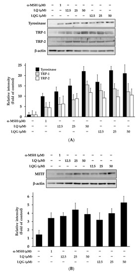 Next, we determined the effects of LQ and LQG on tyrosinase activity using cell-free mushroom tyrosinase and cellular systems. As shown in Figure 3A, LQ and LQG had no effect on the mushroom tyrosinase activity, suggesting that the effects of LQ and LQG on melanin synthesis observed in B16-F1 and HMVII cells are not due to the direct action on the catalytic activity of tyrosinase. By contrast, LQ and LQG significantly induced the intracellular tyrosinase activity in a dose-dependent manner (Figure 3B). These results imply the possibility that LQ and LQG regulate the expression of melanogenic enzymes.