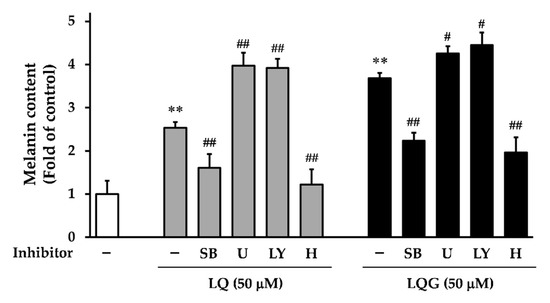 Effects of specific inhibitors on LQ- or LQG-induced melanin synthesis. B16-F1 cells were pretreated with specific inhibitors for 1 h and then treated with LQ (50 μM) or LQG (50 μM) for 72 h, and the melanin content was determined as described in Materials and Methods. Values are the mean ± SEM of three independent experiments. **p < 0.01 versus control. #p < 0.05 and ##p < 0.01 versus LQ- or LQG-treated group. LY, LY294002 (10 μM); SB, SB203580 (10 μM); U, U0126 (5 μM); H, H-89 (2.5 μM).