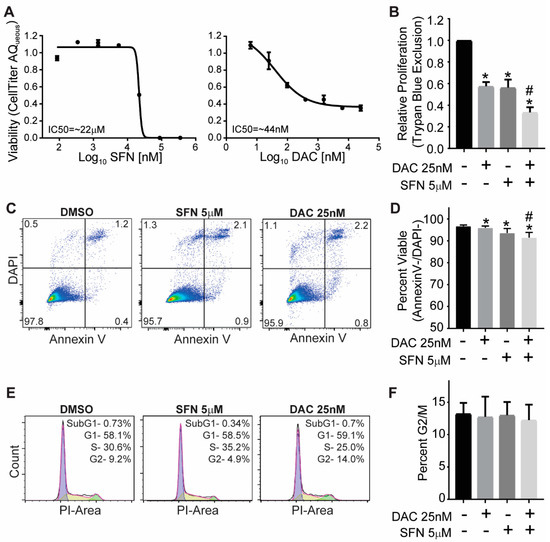 3.2. SFN and DAC Single and Combination Treatment Result in Minimal Apoptosis