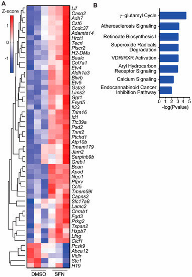 RNAseq data analysis revealed a differential gene expression profile by SFN single treatment compared to control. There were 126 genes with greater than 2-fold change compared to control. The data have been deposited in NCBI’s Gene Expression Omnibus [69]. The top genes with greater than 2.5-fold change (p < 0.001) are shown in the heatmap (Figure 2A). The biological roles of genes responding to SFN single treatment with greater than 2-fold change were analyzed with IPA. The top canonical pathways analysis, with a negative log p-value greater than 2, indicated many important biological pathways dysregulated in response to SFN single treatment (Figure 2B).
