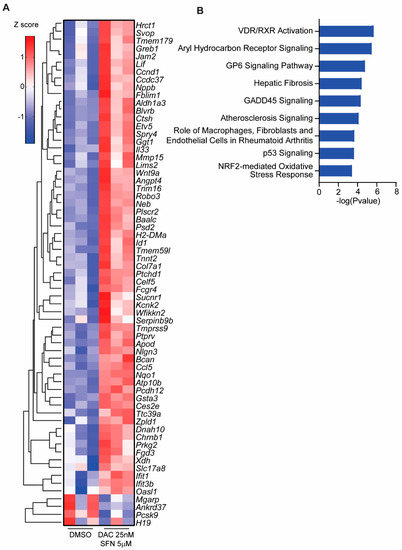 Differential gene expression induced by SFN and DAC combination treatment and the involved biological pathways. (A) Differentially expressed genes from the combination treatment of SFN and DAC compared to control treatments. Genes with greater than 3-fold change (p < 0.001) were analyzed with unsupervised clustering (Z score shown in the color key). (B) Top canonical pathways from the combination treatment of SFN and DAC. Genes greater than 2-fold change than the control with the combination treatment of SFN and DAC were analyzed with IPA for their biological significance. The top nine pathways are shown here.