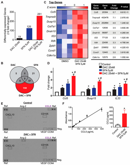 Validation of combination effects from SFN and DAC. (A) The number of differentially expressed genes induced by different treatments. (B) The number of unique genes responding to single and combination treatment. All genes were selected from greater than 2-fold change compared to control with p < 0.05. (C) A heatmap and list of top selected genes from SFN and DAC combination treatments (Z score shows in the color key). (D) Relative gene expression validation by rtPCR of Ccl5, Dusp15, and IL33 between treatments. * Significantly different from control, p < 0.05, # Single treatment is significantly different from combinational treatment, p < 0.05 (Student’s t-test). (E) Expression of cytokines detected by cytokine array. Ref indicates reference spots. Neg: negative control. Arrays were performed in duplicate. (F) Specific CCL5 ELISA further confirmed the increase in CCL 5 in DAC/SFN combination treatment. The left side indicated the standard curve of CCL5, ranged from 7.8 pg/mL to 500 pg/mL. The right side indicates the concentration of CCL5 in the supernatant is increased from 55pg/mL in control to 348 pg/mL in DAC/SFN combination treated group. All data were from two independent biological runs.