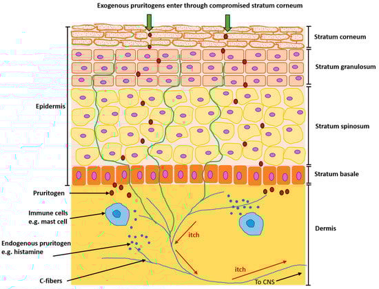 The perception of itch starts when an itch-causing substance, or pruritogen, enters through the stratum corneum and binds to its receptors on sensory afferent nerves, or C-fibers, which transmit the resulting signal to the CNS where the brain interprets it as an itch and initiates a scratch response. Endogenous pruritogens can also be produced by both keratinocytes and immune cells such as mast cells, which produce histamine, a key mediator of itch (Figure 1). The distribution, thickness and density of intraepidermal nerve fibers is much higher in AD skin, which may exacerbate the itch response [].