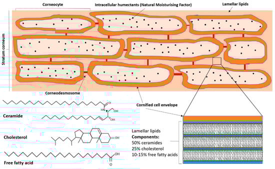 The stratum corneum, the outermost layer of the skin, forms the protective barrier between the inner body and the outside world []. Its barrier functions are numerous, from the prevention of trans-epidermal water loss from the epidermis to the external environment, to protection from external pathogens. It is composed of approximately 15–25 layers of dead, flattened keratinocytes (corneocytes) embedded in a lipid bilayer [], which gives rise to the “brick and mortar” model most commonly used to describe it []. The lipid bilayer consists of approximately 50% ceramides, 25% cholesterol and 10–15% free fatty acids, with small amounts of glucosylceramides and phospholipids []. Instead of the plasma membrane that encases living cells, corneocytes are surrounded by an insoluble cornified cell envelope composed of a monolayer of ceramides, and are held together in the lipid bilayer by corneodesmosomes, modified desmosomes from the uppermost layer of the stratum granulosum [] (Figure 2).