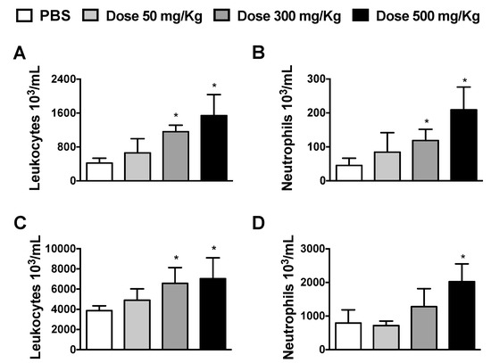 Alhe induces leukocyte accumulation into the peritoneal cavity and peripheral blood. Total leukocytes and neutrophils were evaluated after injection of 300 μL of Alhe at different concentrations (50, 300, and 500 mg/kg) in the peritoneal cavity (A,B) or peripheral blood (C,D). The experiment was conducted twice using five mice per group (n = 10); the error bars denote ± SEM. * indicates control PBS versus different doses. These differences were considered significant when p < 0.05, according to ANOVA with Tukey’s post-test.