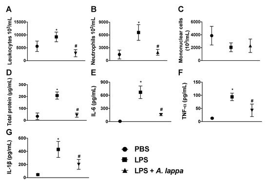 A. lappa extract suppresses inflammation in lipopolysaccharide (LPS)-inflamed air pouches. After 1 h of injection of phosphate-buffered saline (PBS) (PBS/1 mL/pouch) or LPS (1 μg/mL/1 mL/pouch) into air pouches, mice were injected with Alhe (300 mg/kg/1 mL/pouch) or PBS (PBS/1 mL/pouch). Total and differential leukocyte numbers were determined in the lavage fluid, after 4 h. (A) Total leukocytes, (B) neutrophils, (C) mononuclear cell counts, and (D) total protein quantification. (E) IL-6, (F) TNF-α, and (G) IL-1β were quantified by ELISA. The experiment was conducted twice using five mice per group (n = 5), and error bars denote mean ± SEM. * PBS (control) versus LPS; # LPS versus LPS + A. lappa. Differences were considered significant if p < 0.05 according to ANOVA with Tukey’s post-test.