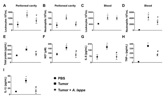 A. lappa extract reduced inflammation induced by tumor implantation. (A,C) Total leukocytes and (B,D) neutrophil accumulation was evaluated in the peritoneal cavity after 30 days of the B16F10 melanoma implantation. The animals received Alhe (50 mg/kg/300 μL) or PBS (300 μL) via i.p. every 5 days for 30 days. (E) Total protein, (F) NO2−, (G) IL-6; (H) TNF-α, and (I) IL-1β were quantified in the peritoneal fluid. The experiment was conducted twice using five mice per group (n = 5). Data represents mean ± SEM. * control versus tumor or tumor + A. lappa; # tumor versus A. lappa. Differences were considered significant with p < 0.05 according to ANOVA with Tukey’s post-test.