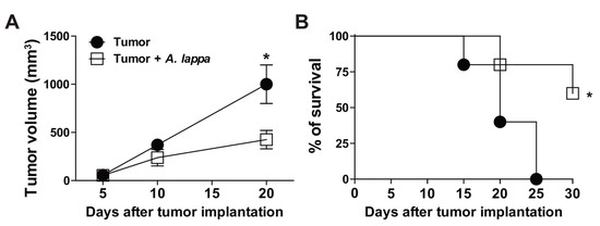 A. lappa extract reduces tumor growth and rescues animal mortality. (A) For assessment of tumor size and (B) mice survival, B16F10 melanoma cells were implanted and the animals received Alhe (50 mg/kg/300 μL) or PBS (300 μL) every 5 days for 30 days. (A) Tumors were measured with a Vernier caliper, and tumor volume was calculated with the equation—tumor length × height × width/2. (B) Animal survival was monitored for 30 days. The experiment was conducted twice using five mice per group (n = 5). Data denote mean ± SEM. * Tumor versus tumor + A. lappa. Differences were considered significant with p < 0.05, according to ANOVA with Tukey’s post-test (tumor growth) or the log-rank test (mice survival).