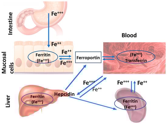The duodenum plays a very significant role in dietary iron absorption. The absorbed iron can be stored in the enterocytes or enter the circulation and be transported around the body bound to the liver-derived plasma protein transferrin (Tf). It is then taken up by tissues and utilised for many processes, such as erythropoiesis in the bone marrow, myoglobin synthesis in muscle, and oxidative metabolism in all respiring cells. Splenic, hepatic, and bone marrow macrophages, which belong to the RES, have the task of recycling iron from senescent erythrocytes. The liver has an important storing and regulatory function. Through the production of the hormone hepcidin, it controls the release of iron from enterocytes and macrophages into the circulation. Therefore, this permits the fine regulation and the maintenance of plasma iron concentrations within physiological levels. Figure 1 presents the main tissues where iron metabolism occurs.
