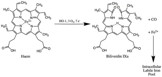 Senescent erythrocytes exhibit markers of ageing, such as a decrease in membrane flexibility and the presentation of phosphatidylserine on their cell membrane []. These changes are recognised by the splenic macrophages triggering erythrocyte phagocytosis. Following phagocytosis, the erythrocytes are included in a phagolysosome and degraded by hydrolytic enzymes and reactive oxygen species to release their haem. Thereafter, the enzyme HO-1, in the presence of oxygen, catalyses the breakdown of haem into iron(II), carbon monoxide, and biliverdin []. Subsequently, Fe2+ ions are transported out of the phagolysosome via the natural resistance-associated macrophage protein-1 (NRAMP1) and enter the cytoplasm to join the LIP []. NRAMP1 is a hydrophobic protein present only in monocytes and macrophages and has a 64% amino acid sequence identity with DMT1, also known as NRAMP2.