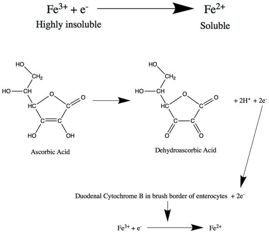 Low stomach pH and dietary ascorbic acid reduces non-haem iron from the highly insoluble Fe3+ form to Fe2+, which is more readily absorbed. Duodenal cytochrome b accepts electrons intracellularly from oxidation of ascorbic acid into dehydroascorbic acid and uses these to catalyse the reduction of Fe3+ to Fe2+.