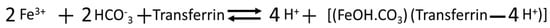 Oxidation of the absorbed ferrous iron back to ferric iron is required for transport by the plasma protein Tf. This is achieved by hephaestin (HEPH), a multi-copper ferroxidase enzyme anchored to the basolateral enterocyte membrane and coupled to FPN1, which catalyses the oxidation of Fe2+ to Fe3+ ions []. Additionally, there is ceruloplasmin, a circulating copper-carrying protein synthesised in the liver, which also exhibits ferroxidase activity []. Fe3+ then binds to Tf, which has a high affinity for Fe(III) and enables iron transport around the body (Figure 4). Apotransferrin (apo-Tf) is the unbound form of this transporter and contains two ferric binding sites, of which none, one, or both may be filled. Under physiological conditions, only about 30% of Tf is saturated. This has an important buffering function that prevents any sudden build-up of non-transferrin-bound iron (NTBI), which, being highly reactive, may cause oxidative injury if taken up by the tissues [].