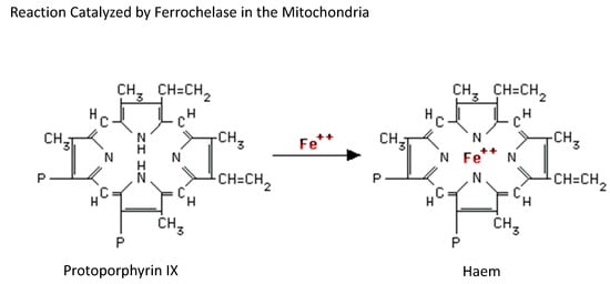 Erythropoiesis begins in the bone marrow once pluripotent stem cells differentiate into erythroid precursor cells in the presence of the hormone erythropoietin. However, haemoglobin synthesis is only initiated when the erythroid precursor cells start to differentiate into erythroblasts, expressing transferrin receptors at this stage and taking up iron. The first and the final steps of haem synthesis occur in the mitochondrion, while the intermediate steps take place in the cytoplasm. The first step, which is essentially rate-limiting, involves the conversion of glycine and succinyl coenzyme A to δ-aminolaevulinic acid (ALA) catalysed by the enzyme ALA synthase. Pyridoxine (vitamin B6) is the coenzyme for this reaction and is stimulated by erythropoietin and inhibited by haem. The laevulinate product is exported into the cytoplasm, and the condensation of two ALA molecules forms a monopyrrole pyrrole ring (porphobilinogen) (PBG) by a condensation reaction. Four molecules of PBG form hydroxymethylbilane (HMB) tetrapyrrole macrocycle, which cyclizes to form uroporphyrinogen III. The next step is the modification of the acetate side chains. The decarboxylation reactions produce coproporphyrinogen, which enters the mitochondrion to be converted into porphyrinogen IX, i.e., the sequential oxidative decarboxylation of the two propionate groups of pyrrole rings to two vinyl groups. The final step in the haem biosynthetic pathway is the oxidation of porphyrinogen IX to protoporphyrin IX (Figure 5). Meanwhile, mitoferrin-1, an iron transporter, facilitates iron entry into the mitochondrion []. By interacting with the ATP-binding cassette transporter ABCB10, mitoferrin-1 binds to mitochondrial ferrochelatase to form an oligomeric complex []. Ferrochelatase catalyses the final step of this synthetic reaction by inserting iron into protoporphyrin IX to produce haem. Subsequently, haem is exported into the cytosol via mitochondrial haem exporters and combines with globin chains formed on ribosomes to generate haemoglobin. With repeated cellular divisions, the nucleus condenses and is eventually lost, thus resulting in a reticulocyte. Ultimately, the remaining RNA is also lost from the circulating reticulocytes, which mature into erythrocytes.