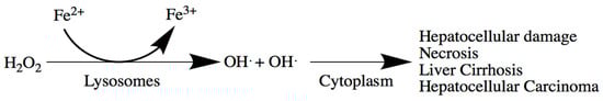 Fenton reaction to produce hydroxyl radicals, which can cause membrane damage and hepatocellular damage, necrosis, liver cirrhosis, or hepatocellular carcinoma once they are in the cytoplasm.