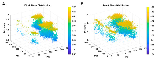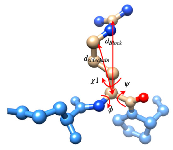 Five features, backbone torsion angle Phi (φ) and Psi (ψ), sidechain torsion angle (), sidechain size (), and block length (), were selected to describe the conformation of a protein residue as shown in Figure 1. The torsional angle φ is formed by atom C located in the previous residue of the protein sequence and atoms N, CA, C in the target residue. N, CA, C are the atom names in a residue representing the nitrogen atom, the carbon atom connecting to a sidechain and the carbon atom in the carbonyl along the protein backbone from the N side to C side. The angle ψ is formed by atoms N, CA, C in the target residue and atom N in the next residue in the sequence. The dihedral angle is the first torsion angle in the sidechain which is formed by atoms N, CA on the backbone and CB, and CG on the sidechain. The range of torsion angles in the study is 0° to 360°, which is from Biopython directly instead of −180° to +180° in the Ramachandran plot [48]. Eighteen of 20 residues were used since glycine (GLY) and alanine (ALA) have no due to their small size of side-chains. is the distance between the CA atom on the backbone and the mass centroid of the sidechain atoms. is the distance between the CA atom on the backbone and the mass centroid of the distal block of a specific residue. The blocks of the residues were defined in He’s study [49].