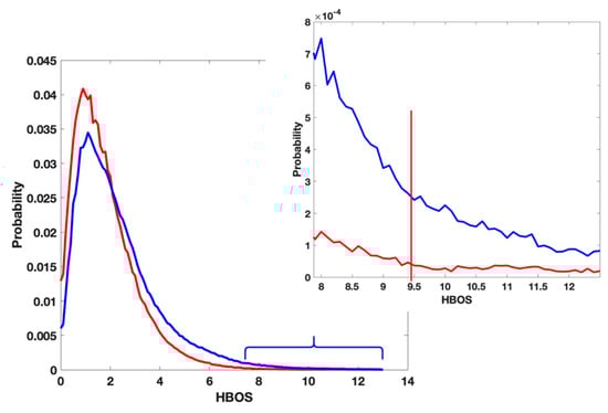 The distribution of Histogram-Based Outlier Score (HBOS) value of residue in X-Ray-1.5 (red) and Electron Microscopy (EM) data sets (blue).
