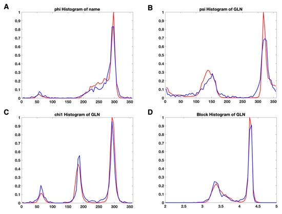 The normalized histogram plot of four features of Glutamine (GLN) for X-ray-1.5 data set (red) and EM-2-4-(2016, 2018) data set (red). (A) the normalized histogram plots of φ; (B) the normalized histogram plots of ψ; (C) the normalized histogram plots of ; (D) the normalized histogram plots of .