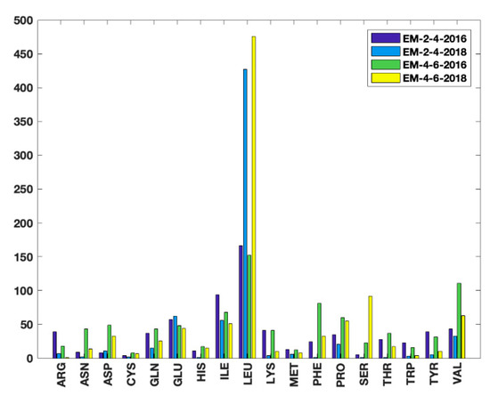 The numbers of residues that are labeled as safe in PDB validation reports and anomalies by the HBOS model for 18 residue types in four EM datasets are summarized in Figure 7. Such residues are referred to as HBOS outliers. The four bars from left to right for each residue type represent the results from EM-2-4-2016, EM-2-4-2018, EM-4-6-2016, and EM-4-2018, respectively. It is to be noted that residues with a large sidechain were assigned better conformations from 2016 to 2018. For instance, 39 arginines (ARG) HBOS outliers were labeled from the 215 proteins of the EM2-4-2016 dataset. The number drops to seven in the 288 proteins of EM-2-4-2016. Only one ARG HBOS outlier ws identified from the 160 proteins in EM-4-6-2018. Considering that the mid-resolution density maps have higher uncertainties of atomic coordinates, the quality improvement in EM-4-6-2018 may be due to the use of conformation information extracted from known protein structures, by which the favorable feature values are assigned to residues. It is also noted that Leucine (LEU), Serine (SER) have much more HBOS outliers labeled in EM-4-6-2016 and EM-4-6-2018 than EM-2-4-2016 and EM-2-4-2018. Most of those LEU and SER outliers are located on long loops or loops between two secondary structures, where residues have more flexibility for assigning conformations. The unexpected results can be generated from the essential modeling process. After assigning reasonable conformations to most of the residues in the sequence, the conformation of LEU and SER on loops are assigned. At this moment, it is challenging to have LEU and SER reasonable conformations to meet all constraints. In order to meet the majority of constraints, instead of using the conformations with rigid bonds and plane angles for LEU and SER, the coordinates of the atoms on the sidechain are slightly adjusted. Although the dihedral angles are still in the favorable region, the conformations are abnormal. The current tool in the OneDep system is not sensitive enough to identify these outliers. In the HBOS model, and are effective in monitoring the anomalous residue from the adjustment of the atom coordinate. By combining with the other three torsion angles, the model is sufficient to serve as a complement to the current PDB validation tool.