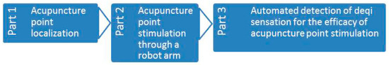 In this article, the design of an automated robotic acupuncture system is presented. The system consists of three main components: (1) Acupuncture point localization, (2) acupuncture point stimulation through a robotic arm, and (3) automated detection of a possible deqi event for the efficacy of acupuncture point stimulation (developmental stage). The overall system design is schematically shown in Figure 1.