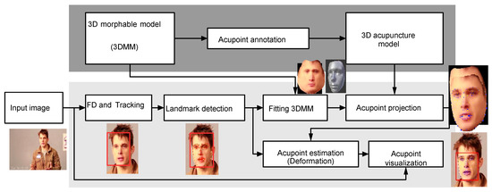 Given that the acupoints are defined in a 3D space, a 3D face model is useful for acupoint localization. The 3D Morphable Models (3DMM) [8,9,10,11] are common for face analysis because the intrinsic properties of 3D faces provide a representation that is immune to intra-personal variations. Given a single facial input image, a 3DMM can recover 3D face via a fitting process. More specifically, a large dataset of 3D face scans is needed to create the morphable face model, which is basically a multidimensional 3D morphing function based on the linear combination of these 3D face scans. By computing the average face and the main modes of variation in the dataset, a parametric face model is created that is able to generate almost any face.